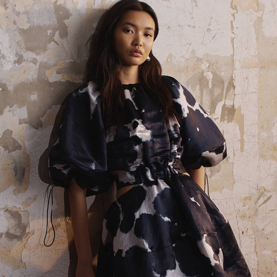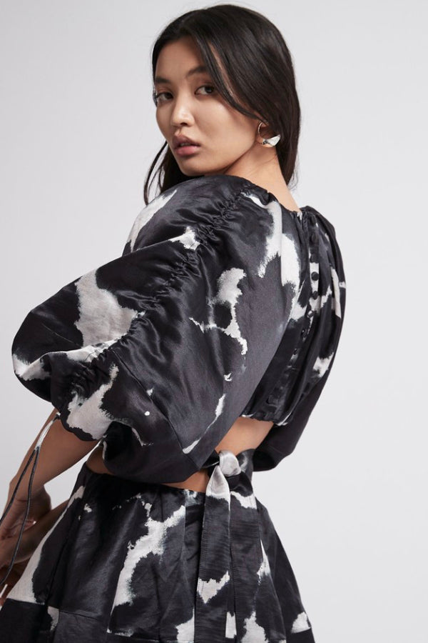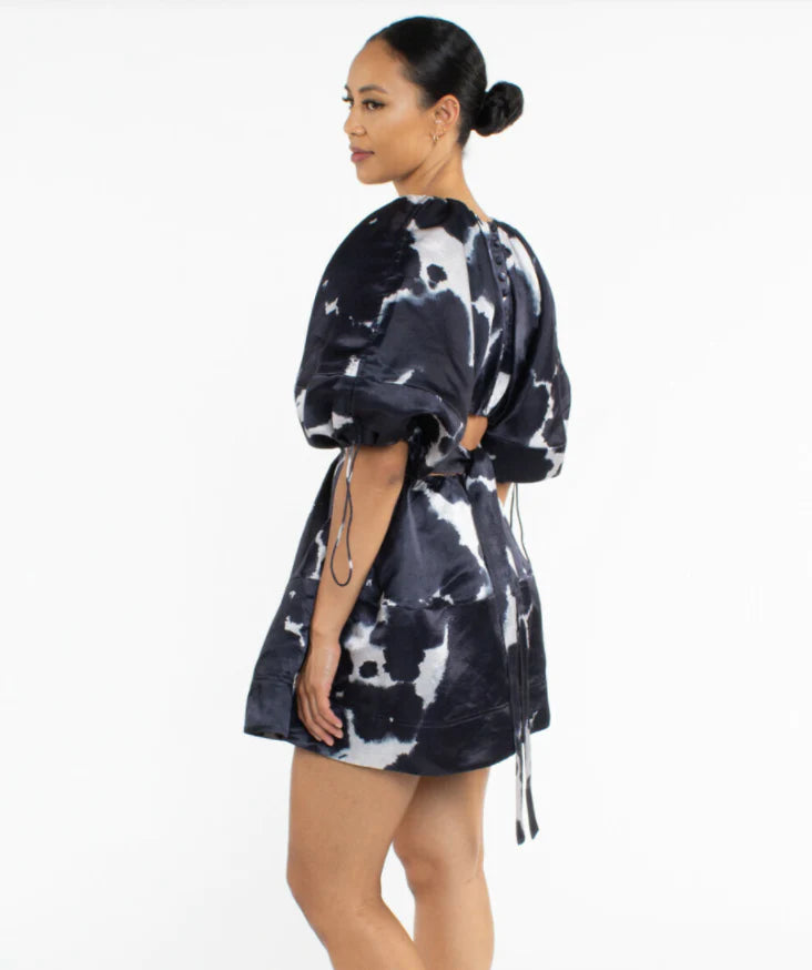 - This garment will make you best dressed at any event. Featuring details including; artistic ink blot pattern, voluminous puff sleeves with drawstring, gathered waist, adjustable waist tie, and cut outs on side and back. Fabrication: Linen and silk blend. Colour: Black, white