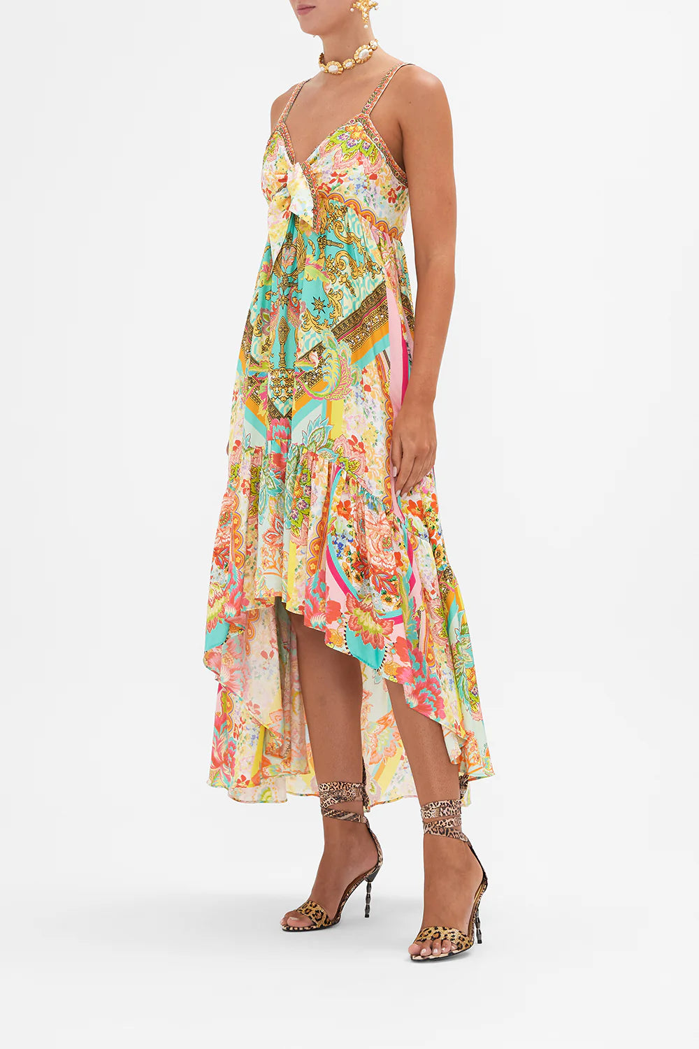 The An Italian Welcome Tie Front High Low Dress celebrates the bold and vibrant spirit of timeless Italian culture and hospitality. A colourful palette of retro inspired florals entwined with geometric pattern. Adorning CAMILLA crystals, this luxury silk dress plays host to tie detailing at the sweetheart neckline, a fitted waist, zip fastening and relaxed silhouette that falls into a flared high-low hemline. The epitome of femininity wear as a dramatic sundress or accessorise and elevate for elegant evening wear