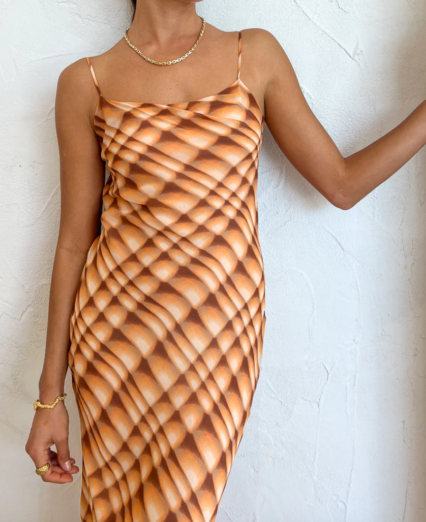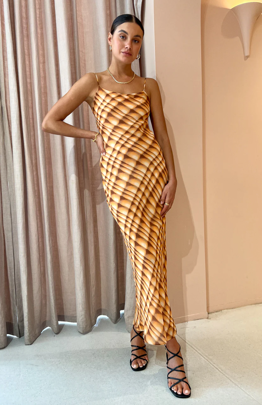 Radiate sunshine at any Coco event with the striking Soleil Slip maxi Dress in Golden Hour Check by Bec + Bridge.