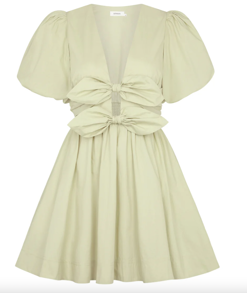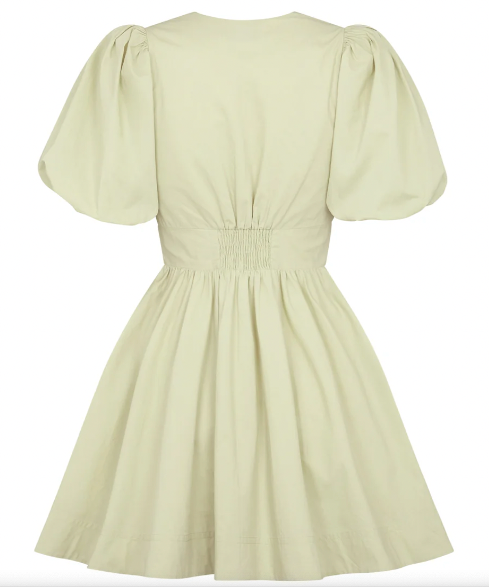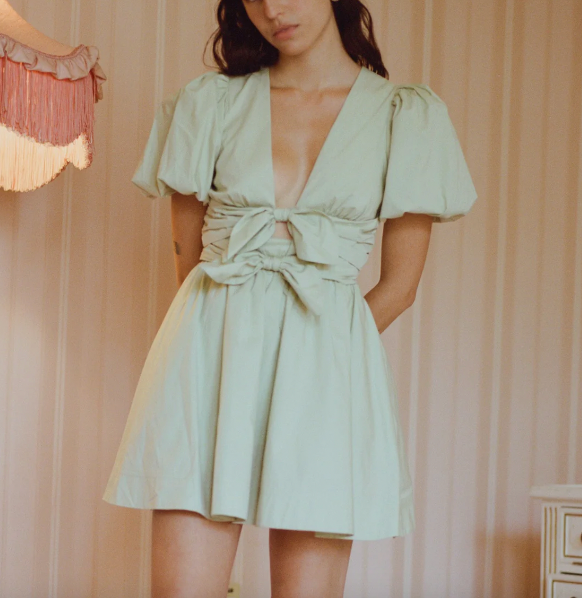 The Devon mini dress in pistachio is made from butter-soft cotton poplin, featuring double bow front details, blousy puff sleeves and a flattering deep V-front neckline.
