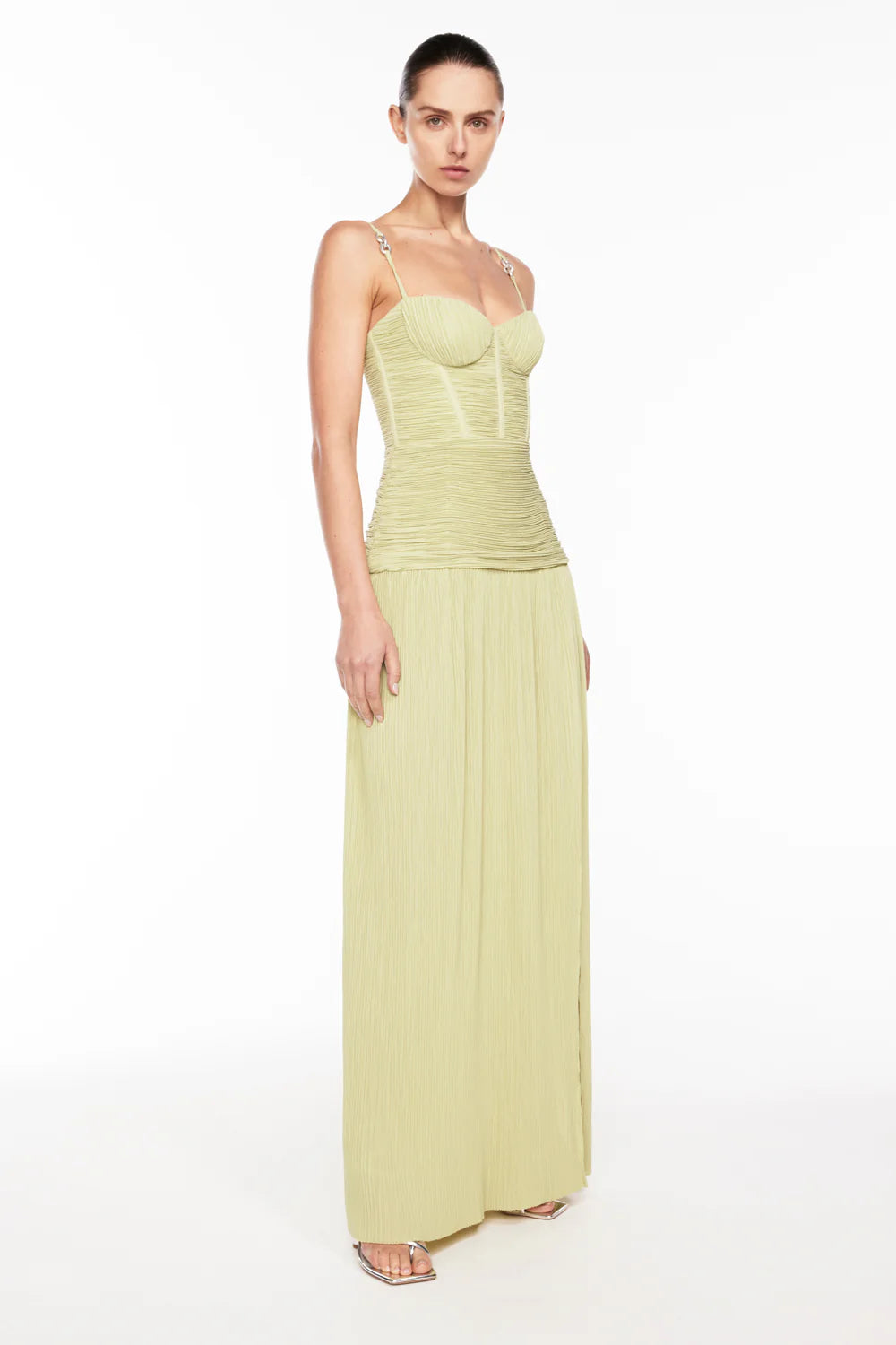 Make a stylish statement at your next event in the Double Time Pleat Dress. The dress features elegant pleats throughout and considered boning through the corset top and flows into a beautiful maxi skirt with a subtle split.
