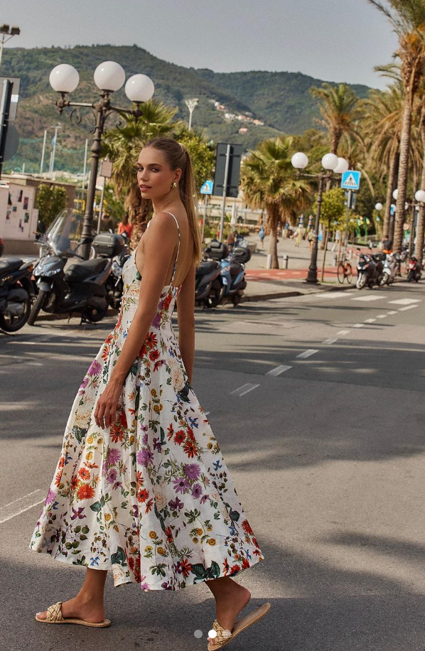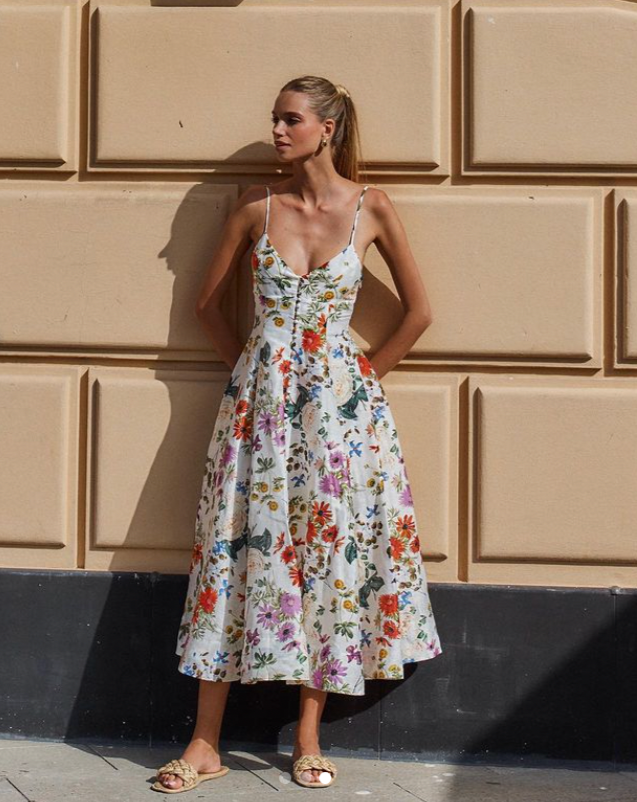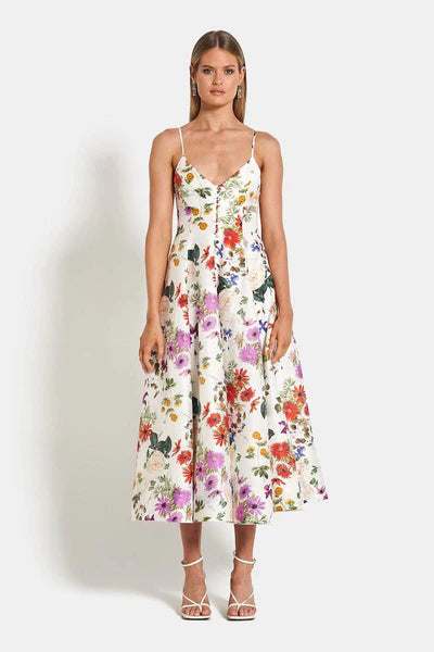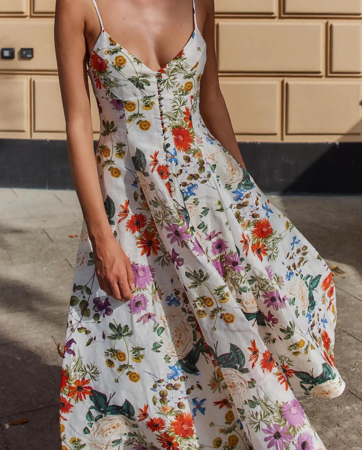 Embrace timeless elegance with an A-line midi silhouette adorned with delicate button accents down the centre front. Features include thin adjustable straps, a graceful V-neckline and shaped panelling to ensure a flawless fit. Crafted from exclusive linen nylon fabric, its ability to effortlessly transition from a day to night outfit makes it a coveted choice for an occasion.