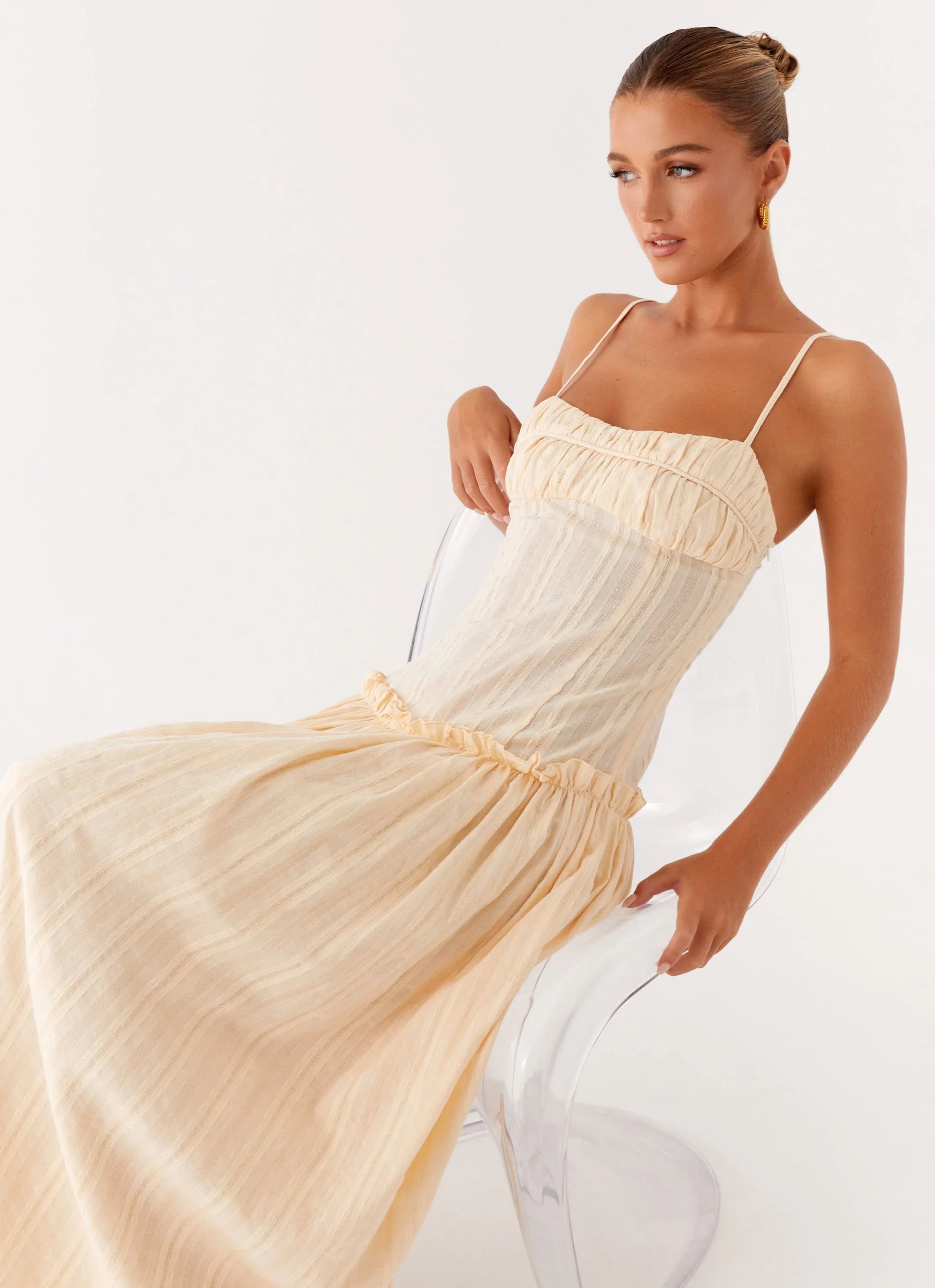 Jacinda Drop Waist Maxi Dress – Effortless elegance with a hint of sultry charm. The rounded neckline and open back create a perfect balance of sophistication and allure, while the A-line skirt flows gracefully for an unforgettable look from every angle.
