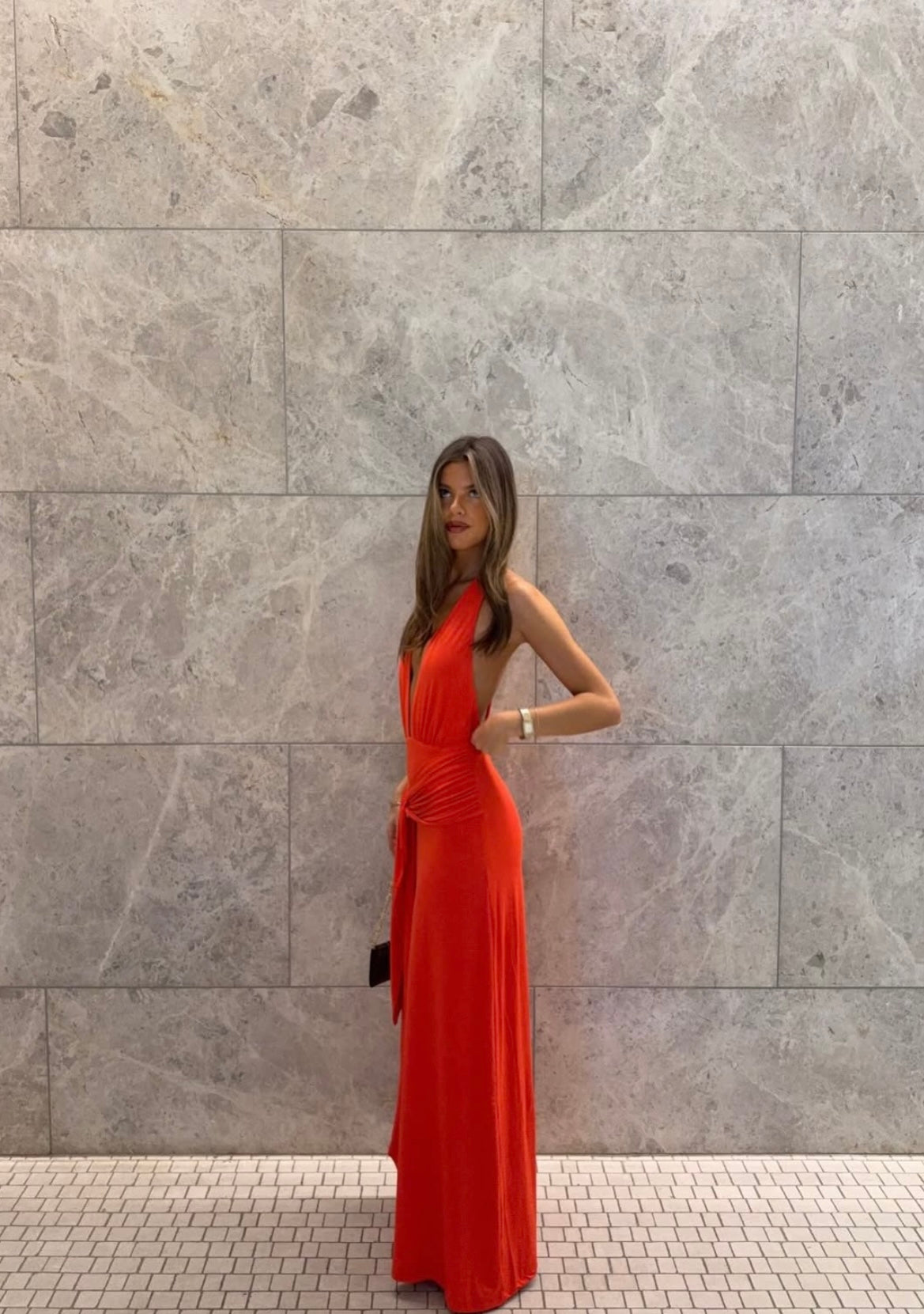 The Jasmine Maxi Dress delivers effortless elegance with its fluid silhouette and refined details. A plunging halter neckline lengthens the frame, while the softly draped bodice and adjustable sash-style waist tie add shape and movement. The sleek racerback balances the dramatic front, flowing into a full-length skirt that moves beautifully with every step - ideal for evenings that call for a polished, understated look.