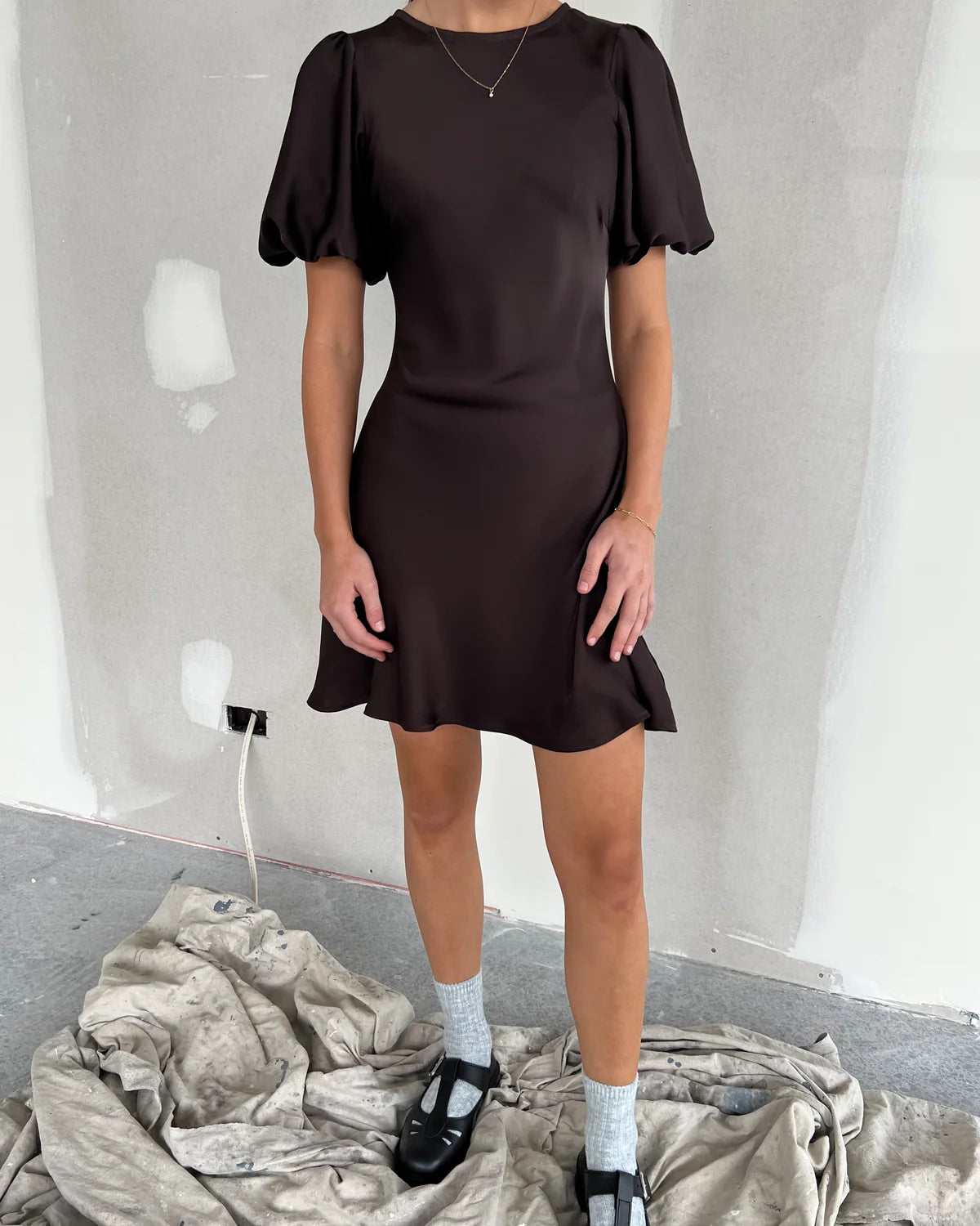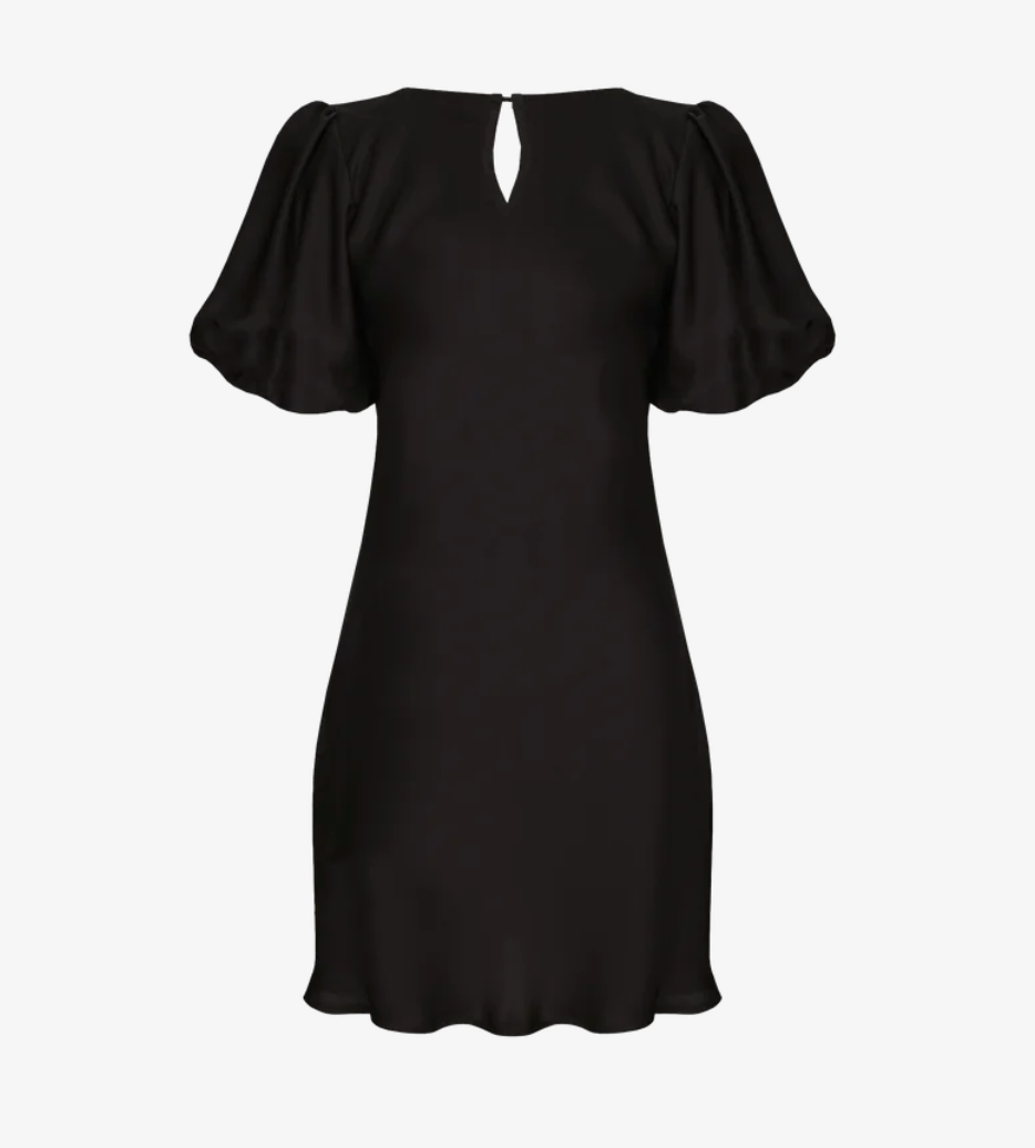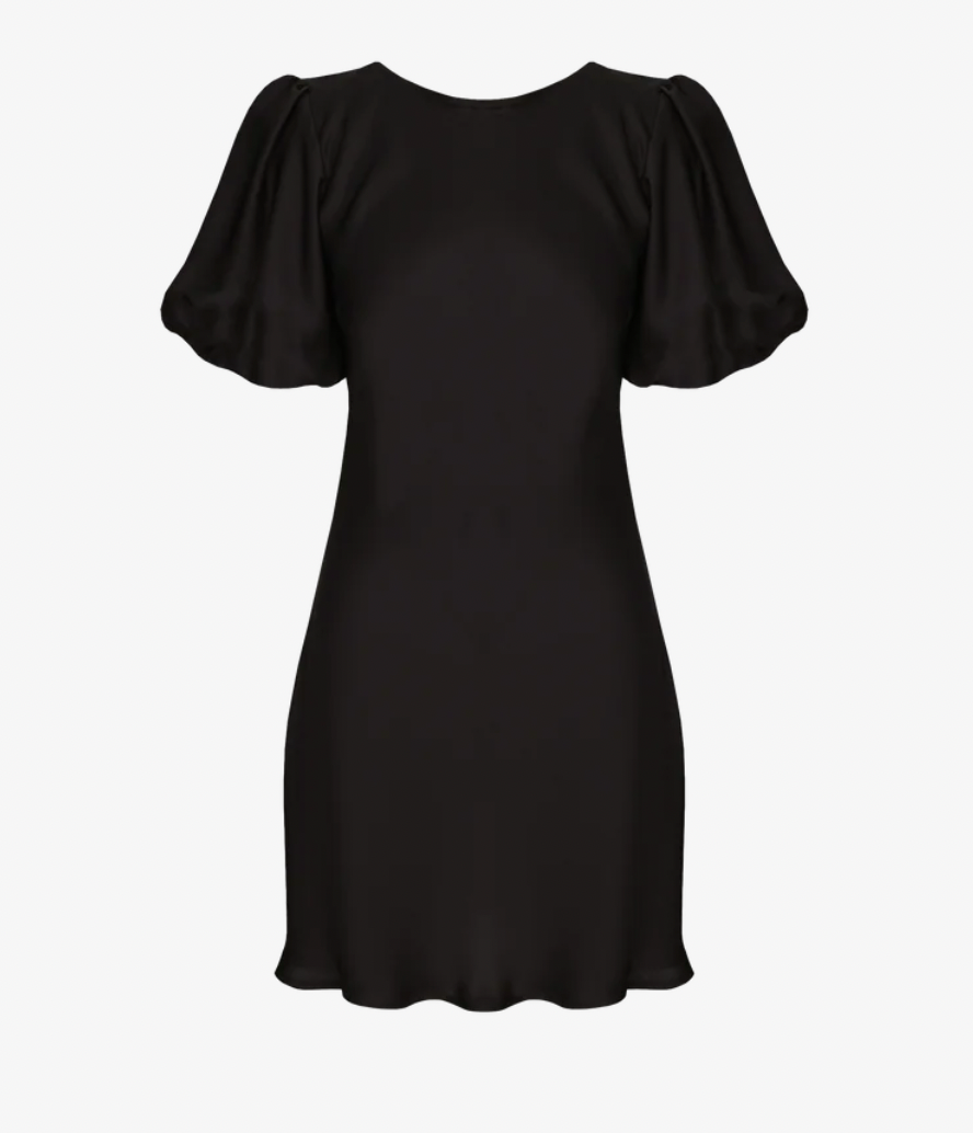 Bias cut satin minidress with puff sleeves and a keyhole button closure at the back neck. The bias silhouette of this dress gently contours the body.