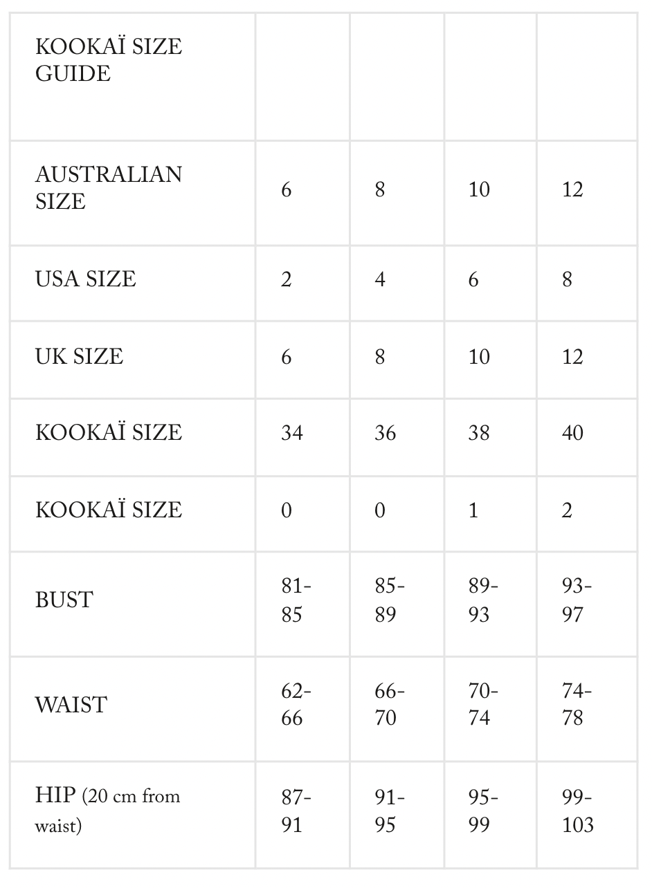 - Measurements: bust 85-89cm, waist 66-70cm, hip 91-95cm (this is a guide from the Kookai website for all of their garments).