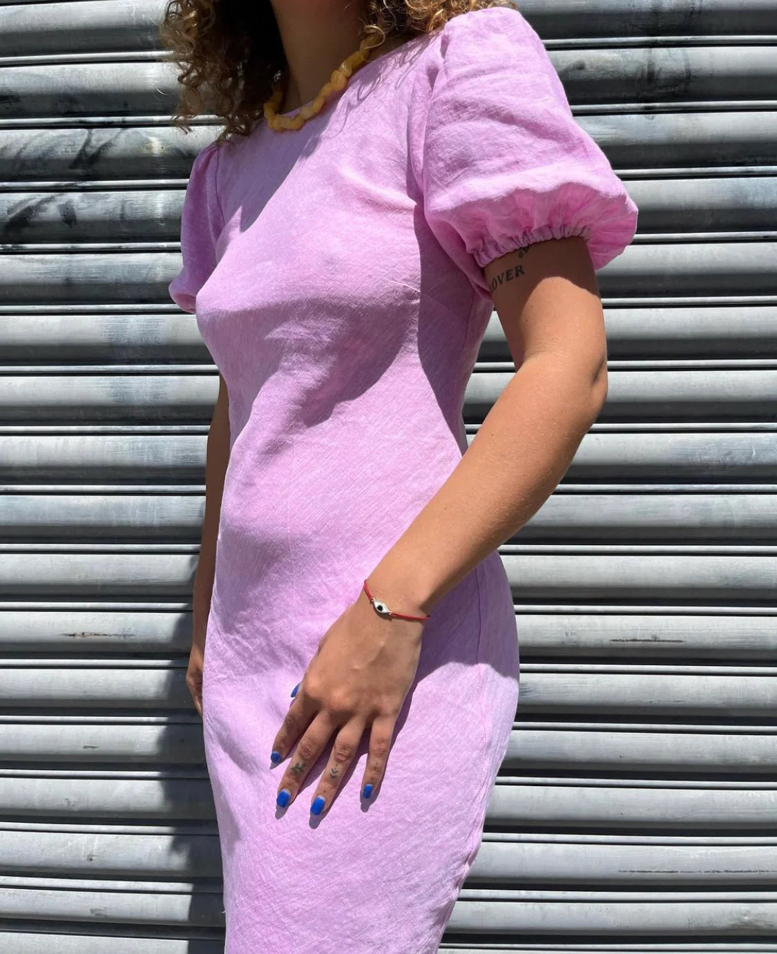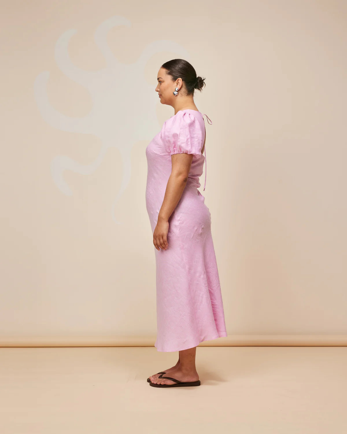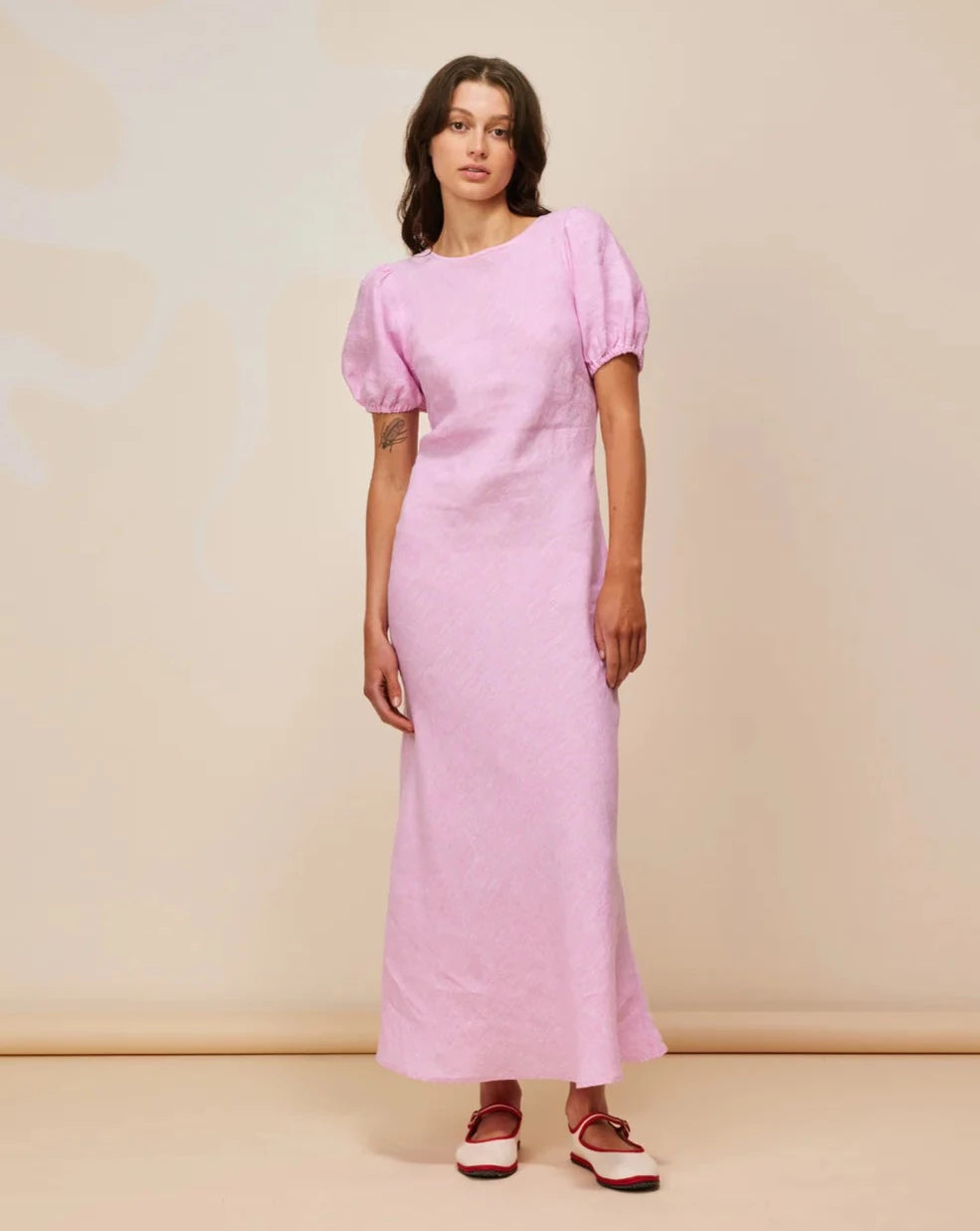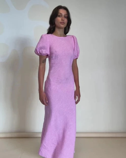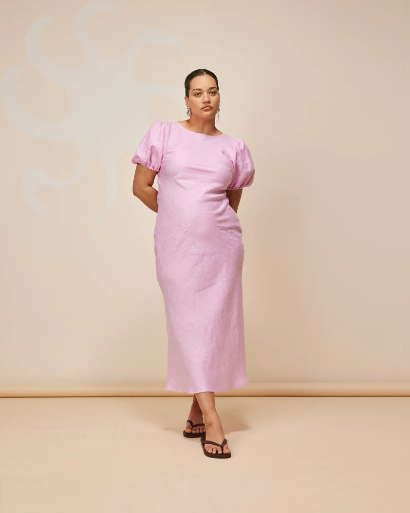 An update on a much loved Rubette favourite, the Kos Linen Dress is a bias cut dress with a subtle puff sleeve and cut out back. Cut from a soft pink linen, this piece is designed to perfectly skim over your body, while the puff sleeves elevate the simple silhouette.