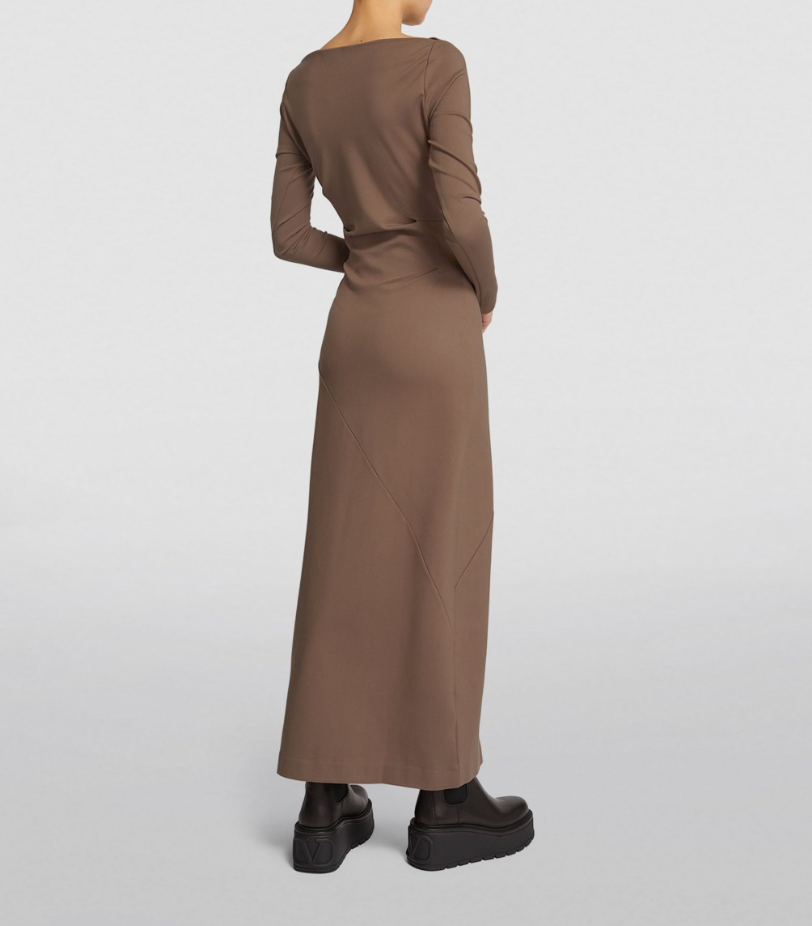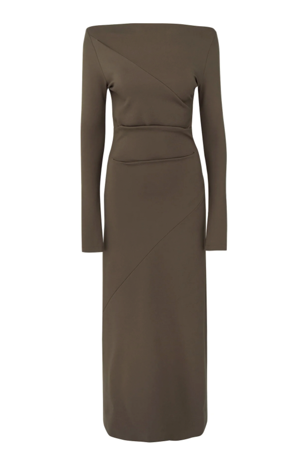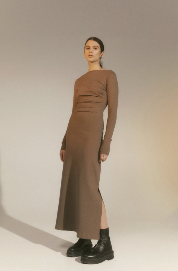 The Mathilde Dress is a long sleeve style with soft tucks and folds at the waist to create a flattering draped silhouette that gently contours the body. Crafted from a thick ponte stretch fabric, it is as comfortable as it is elegant, making it perfect for all-day wear.