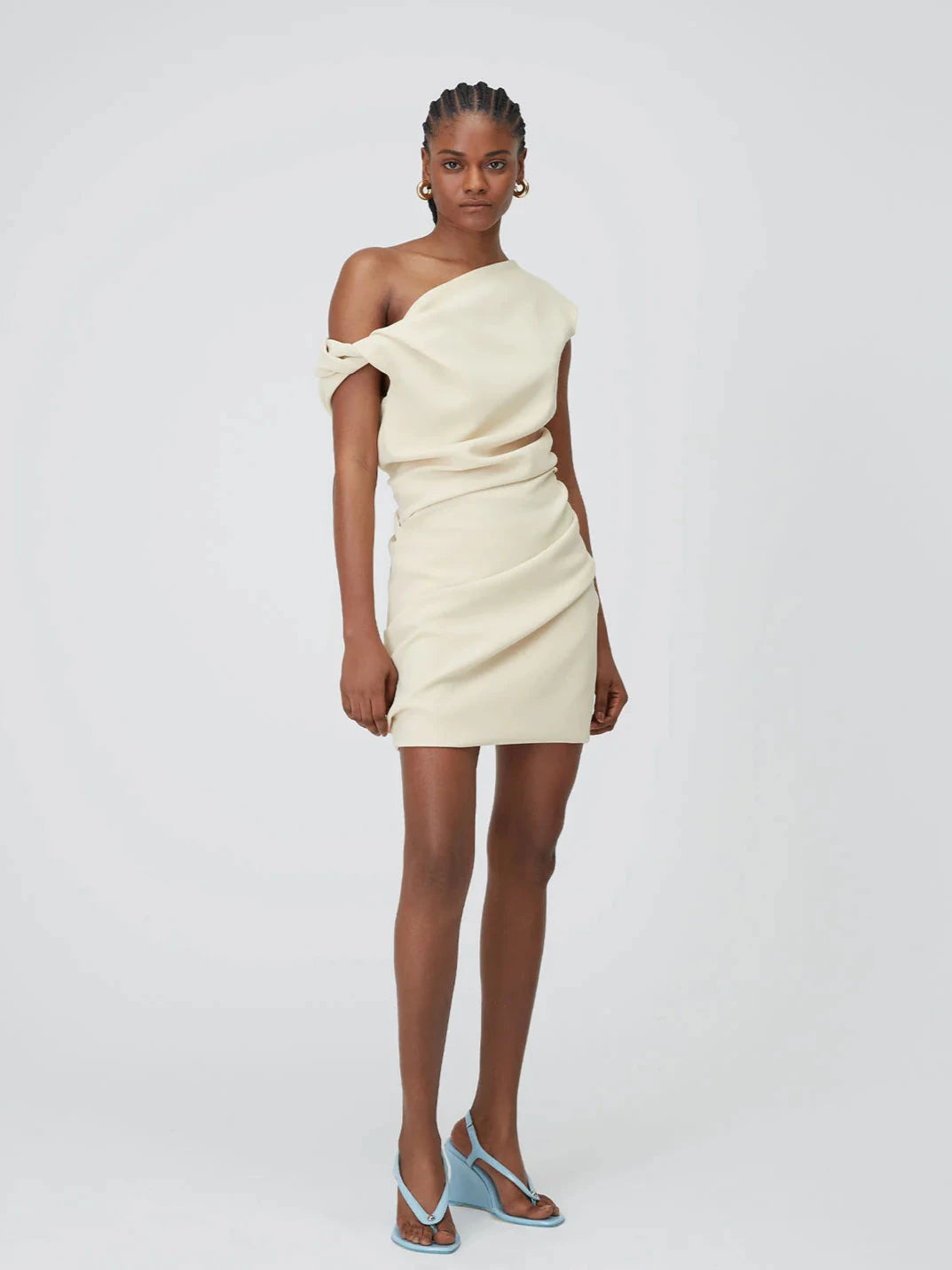 A softly structured mini dress that drapes off one shoulder. Bagged out to create a subtle puffy like effect. Note: model is 6FT