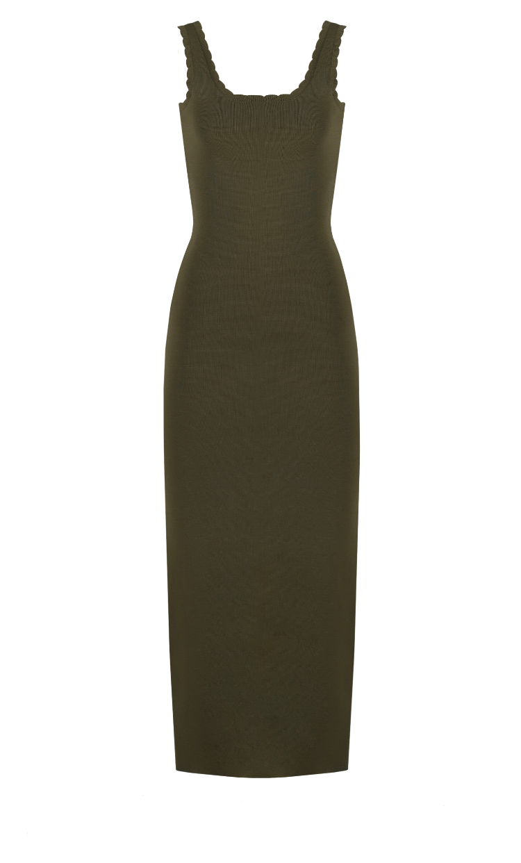 - Sleeveless maxi dress with a square neckline and scallop edging throughout, made in a medium weight rib knit. Designed for a close and flattering fit that hugs you in all the right places.