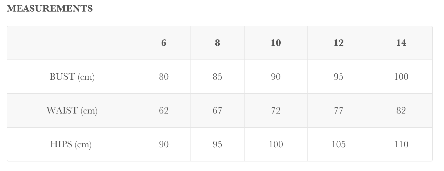 - Measurements: Bust: 85cm, waist: 67cm, hips: 95 cm. (This is a rough guide from the Sofia the label website for all of their products)