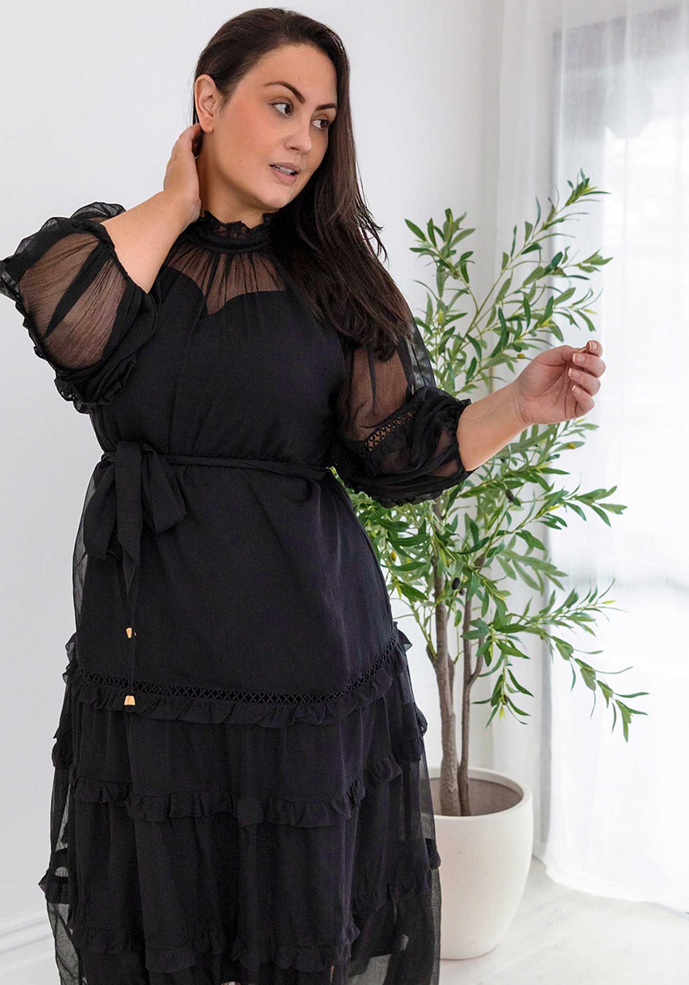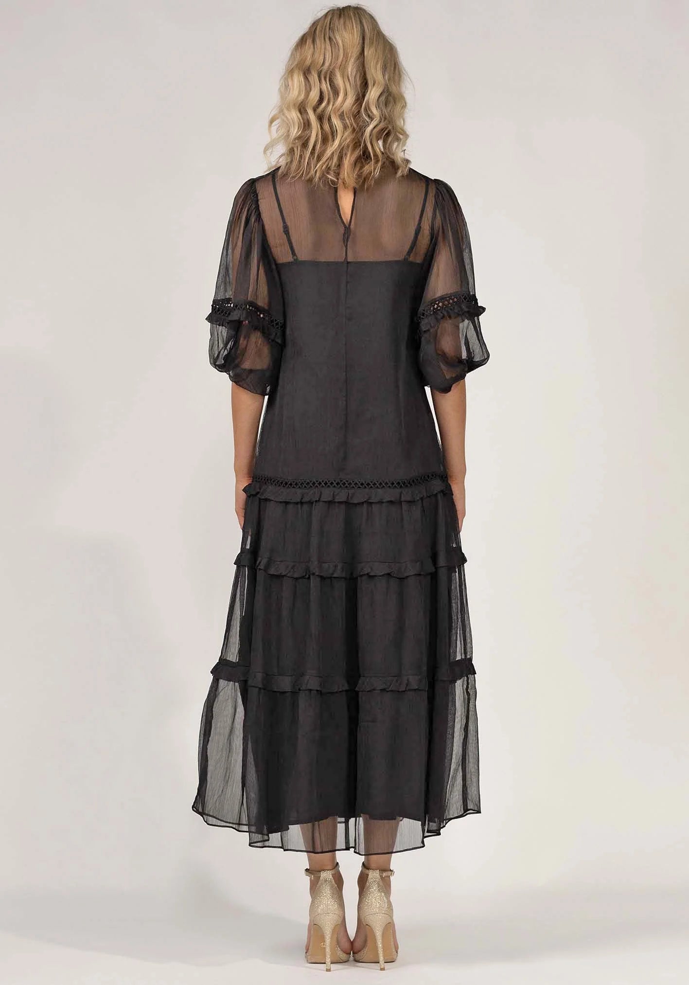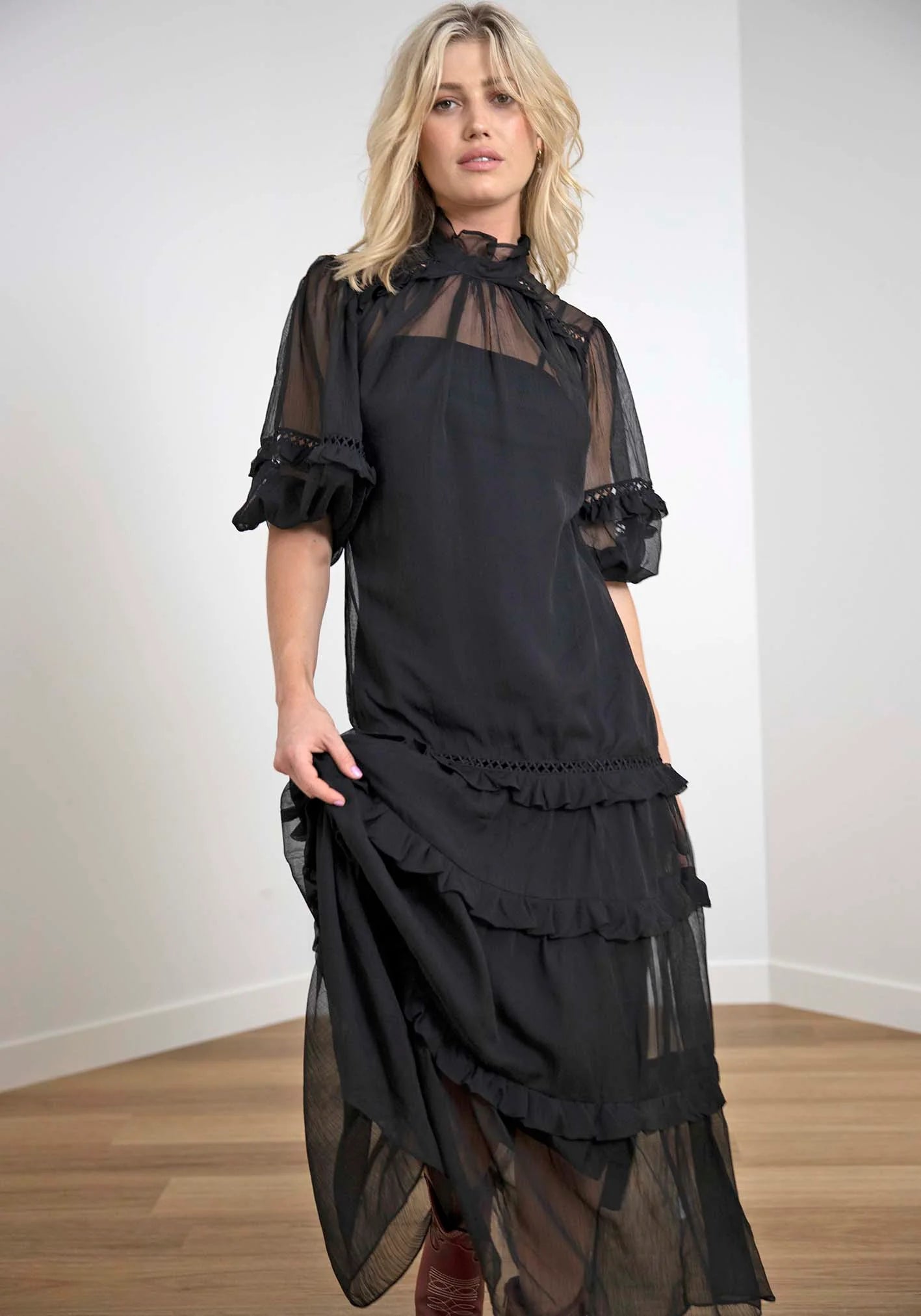 -Cross hatch trim and frill detail at shoulders, sleeve, and skirt