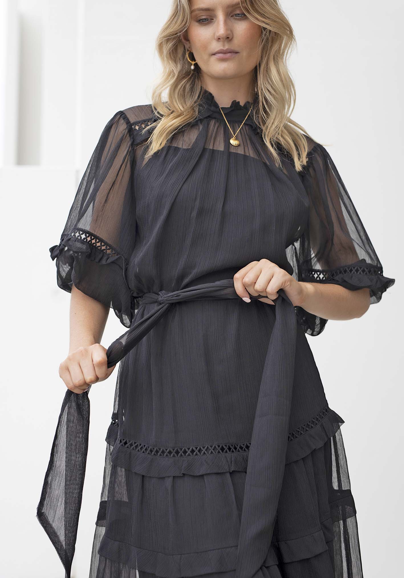 -Dress is sheer fabric with stripe texture detail, comes with removable black slip and wide fabric belt