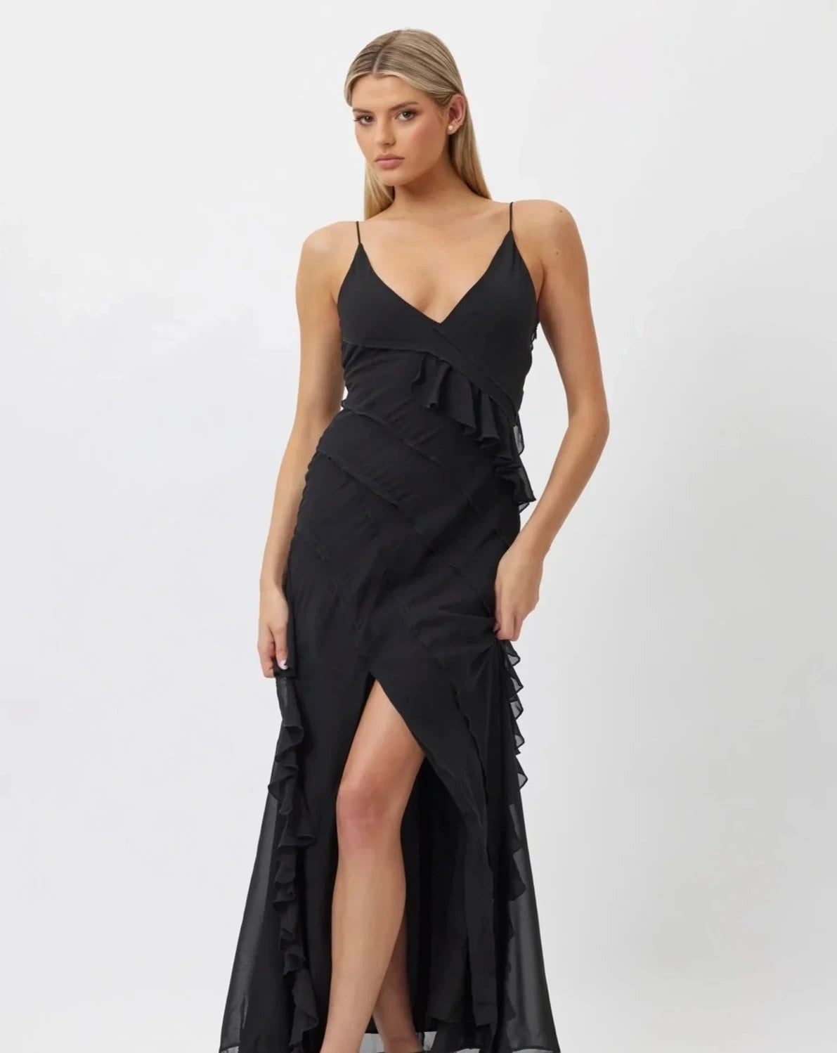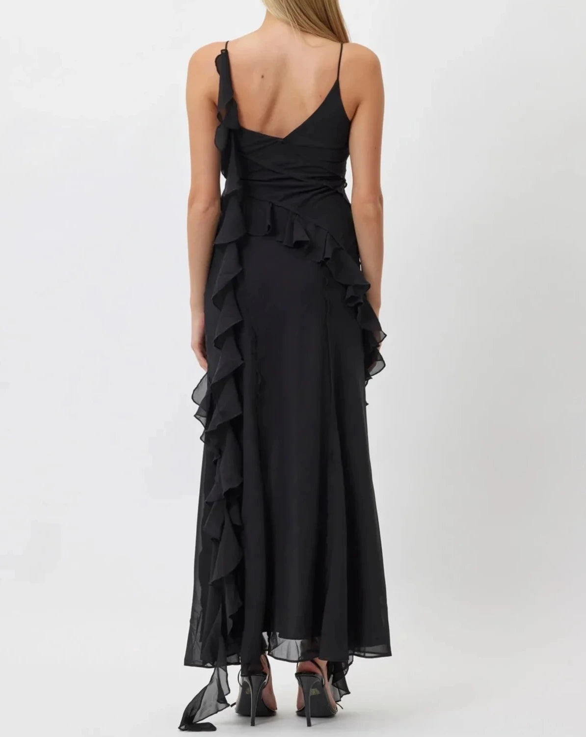 The Valerie Maxi Dress features a V Neckline, thin spaghetti straps, ruffles at the front waist, back waist and back shoulder.