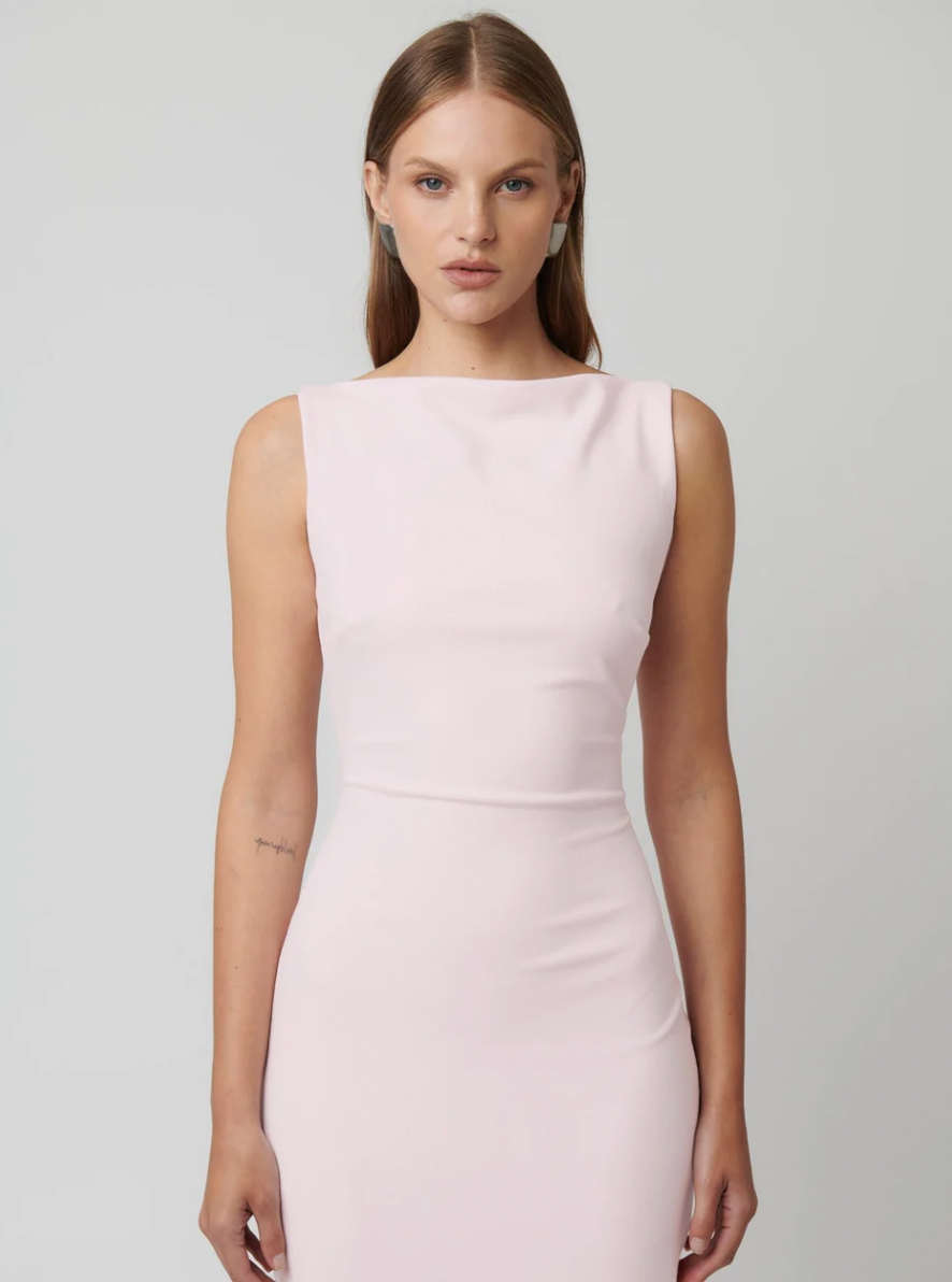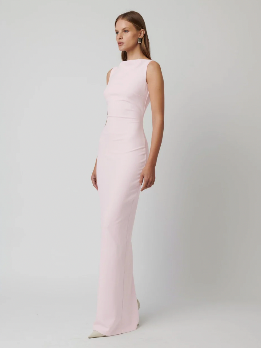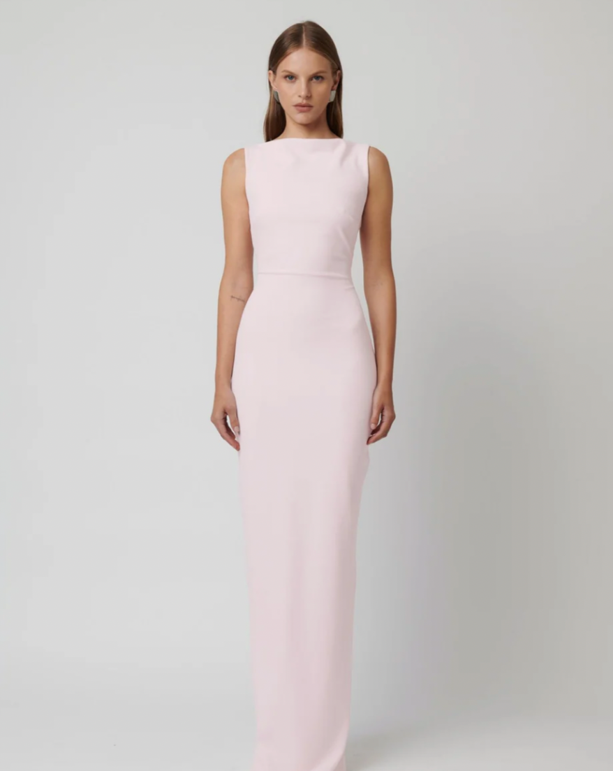 Our 'Verona' gown is so evocative of '90s glamour. Made from luxurious stretch-crepe, it has the decade's defining high neckline and simplistic silhouette. Complement the gown with a statement earring and hand held clutch.